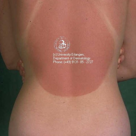 A sunburn is your skin’s response to overexposure to UV radiation. The skin turns red, becomes hot, and painful. A severe sunburn may even result in swelling and/or blistering. The length of time that will cause such reactions varies from person to person. Dark skin helps protect your skin from such a reaction through a larger amount of melanin which absorbs damaging solar radiation. Fair skin contains a smaller amount of melanin and therefore burns more easily and is more susceptible to damage. A tan in a light skined person is a sign of sun damage and the skin trying to prevent further damage.