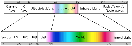 Light rays form waves and carry energy. Therefore they can be compared to waves of water. On a calm day the ocean has waves that are far apart. Their wavelength (from one peak to the other) is long and they do not carry much energy. The same with light – some light has long waves and does not carry much energy, other light has short waves, very close together, that carry lots of energy which may be harmful (ultraviolet-light). Just like the ocean waves after a hurricane.