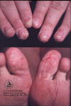 Verteilung: Bei Säuglingen manifestiert sich die Erkrankung häufig im 3. Lebensmonat und führt zu akuten, meist nässenden Hautveränderungen im Gesicht, am behaarten Kopf und an den Streckseiten der Extremitäten. Bei Kindern treten die Hautveränderungen in ähnlicher Verteilung wie bei Erwachsenen auf, und zeigen sich meist in den Beugefalten und am Hals. Typisch für die Verteilung bei Erwachsenen ist der Befall der großen Beugen, der Hände und/ oder Füße und der Periorbitalregion, wobei aber auch Kopf und Hals manchmal betroffen sind. In schweren Fällen kann ein flächenhafter Befall der Haut bis hin zu einer generalisierten Erythrodermie auftreten.