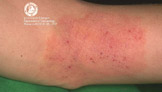 Klinisches Bild: Akute Hautveränderungen zeigen sich als stark juckende erythematöse Papeln und Bläschen, die zu Schuppung und Krustenbildung führen. Subakute Hautveränderungen sind durch erythematöse Papeln und Plaques, Schuppung und Exkoriationen charakterisiert. Für chronische Hautveränderungen typisch sind hyperkeratotische Plaques, Papeln und Lichenifikation. Chronisch-rezidivierende Hautveränderungen können zu postinflammatorischen Hypo- oder Hyperpigmentierungen führen.
