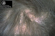 Clinical picture: Extensive scaling, itching and possibly erythema and oozing are characteristic features. Eczematous lesions are localised particularly in the retroauricular area and at the hair line.