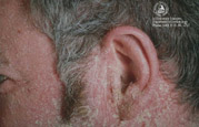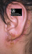 Klinisches Bild: Rötung und Schuppung retroaurikulär, manchmal mit Rhagadenbildung, sind charakterisch für ein atopisches Ekzem, können aber auch bei einem allergischen oder irritativen Kontaktekzem auftreten. Rötung, Schwellung, Schuppung und möglicherweise Nässen können auch an Ohrmuschel oder äußerem Gehörgang auftreten. Hautveränderungen am Ohrläppchen können ein Zeichen für eine Nickelallergie sein, wenn nickelhaltiger Modeschmuck getragen wird.