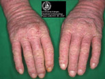 Differential diagnoses: Besides distinguishing between the above-mentioned etiologic factors for eczema on the hands/ feet, the following non-eczematous diseases must also be taken into account depending on the clinical features: With hyperkeratosis and fissuring: Palmoplantar psoriasis, diffuse types of palmoplantar keratoderma, Olmsted syndrome and palmoplantar keratoses in Sézary syndrome are possible differential diagnoses. With vesicles, oozing or bullae: Pustular psoriasis of the palms and soles, epidermolysis bullosa hereditaria, hand-foot-mouth-disease, acrodermatitis enteropathica and scabies in children are possible differential diagnoses for vesicles on the palms and soles. With erythema on the dorsal hand and fingers: dermatomyositis and lupus erythematodes must be taken into account.
