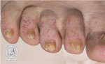 a) Ein 73-jähriger Mann bemerkte seit Jahren eine gelbliche Verfärbung der distalen Großzehnägel. Aufgrund der Schmerzlosigkeit schenkte er dem keine Beachtung und hielt es für eine „Alterserscheinung“. Im Verlauf der Jahre nahm die Verfärbung zu breitete sich von distal nach proximal aus sowie auf andere Fußnägel. Zusätzlich stellte er fest, dass das Schneiden der Nägel durch Verformungen und Brüchigkeit erschwert war. Erst nachdem die verformten Nägel zu Beschwerden in Form von Druckschmerz führten, suchte er einen Hautarzt auf. Er stellte anhand der klinischen Untersuchung und der Pilzkultur die Diagnose einer Onychomykose der Fußnägel. Der Patient erhielt einen antimykotischen Lack (Wirkstoff Amorolfin), worunter es nach ca. 6 Monaten zur Rückbildung kam, sodass allmählich gesundes Nagelmaterial proximal nachwachsen konnte.